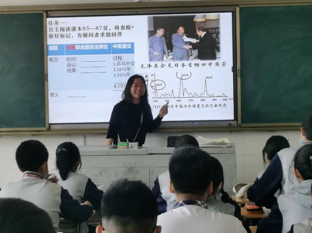 邓丽丽老师展示的初二历史《外交事业的发展》一课,以大单元教学为切入点,通过历史时间轴的形式导入,帮助学生构建历史脉络,同时在课堂当中以表格的形式,梳理本课知识体系,并以驱动型问题的形式启发学生思考。丰富的史实资料、历史图片等让整个课堂的内容更加丰富详实,促进学生历史思维的更好发展。