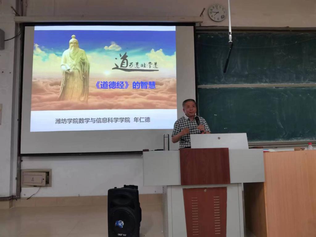 19日晚7:30,北斗教育研究院特聘专家、潍坊学院中华传统文化专家年仁德教授,在潍坊学院8号楼8122室,为数百名大学生和校外的传统文化传播者代表,分享了《道德经智慧》,年教授以哲学意义之“道德”为纲宗,论述修身、治国、用兵、养生之道,指导人们如何修身养性、为人处世。