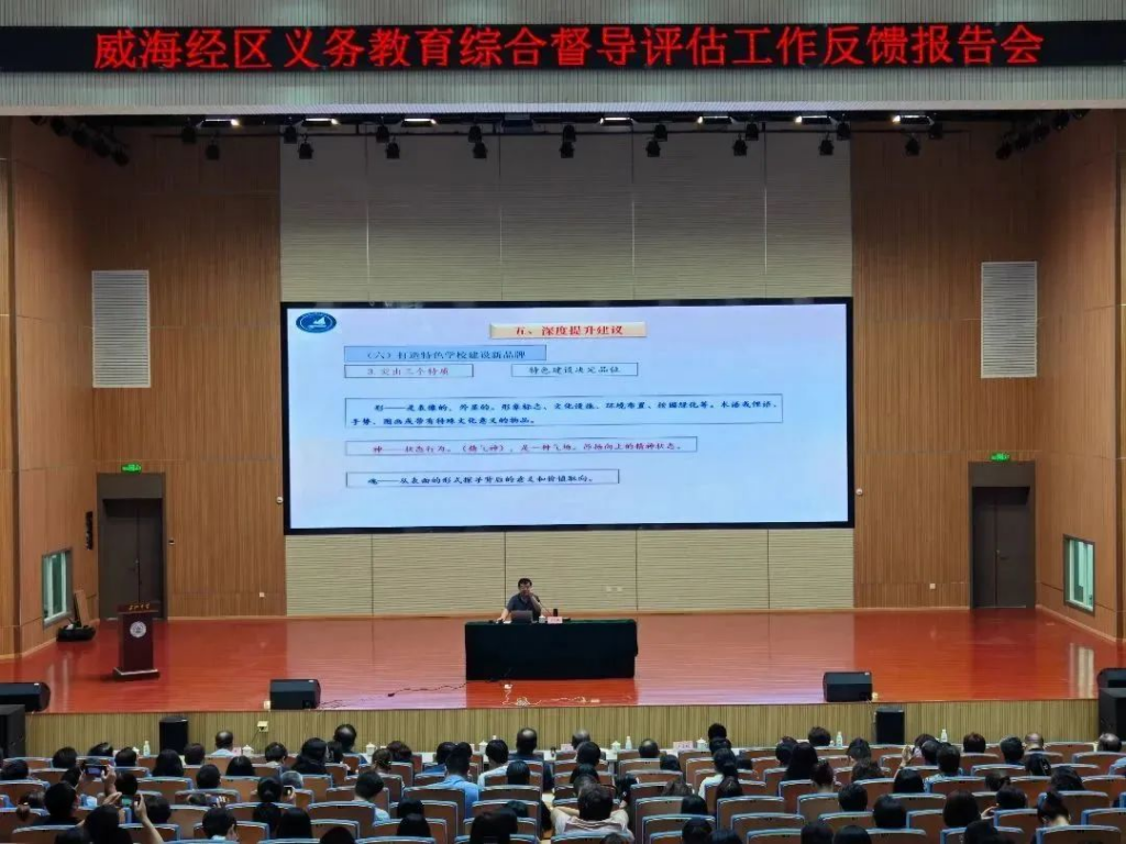 9月16日,威海市经区举行义务教育督导评估工作反馈报告会,山东北斗教育研究院院长贾玉德代表评估团队全面客观分析专家入校督导评估成效。区教育分局党委书记、局长张宗平,班子成员、各科室负责人、教研中心全体人员,以及各中小学中层以上干部,共240余人参加。