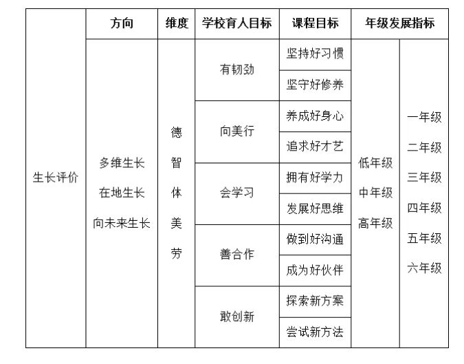 陕西这所小学以“多维生长、在地生长和向未来生长”为发展方向,以“德智体美劳”为发展维度,以学校育人目标和课程目标为发展主轴,以“低、中、高”三大年段为基本单位,由学科教研共同体领衔设计年级发展目标,再落至各个班级,形成从宏观到微观的可操作的、细致具体的评价内容。