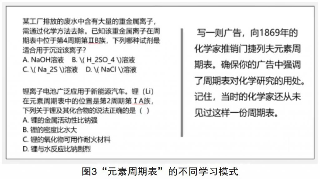 再如化学课上的“元素周期表”,与其用图3左侧中的试题考查学生,不如这样设计任务:“向1869年的化学家推销门捷列夫周期表,强调其对化学研究的价值。”学生需理解周期表的核心逻辑(知识),并用历史视角构建说服力(能力),在“说服他人”的情境中自然生长素养。