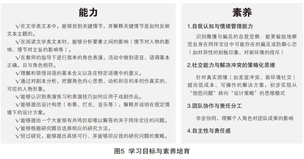七、八年级,是青春期学生滋生傲慢与偏见的敏感期。我们在七年级下学期至八年级设计了“傲慢与偏见”主题课程群(图4),包含9个模块(如“跨文化沟通中的偏见”“媒体报道的客观性分析”等),学生需从中选择2个(中心模块为必选)。无论选择哪两个,都能覆盖图5中的素养——正如我们常说的“不育人,无法教书。”每个学科的知识点,都应成为素养生长的土壤。